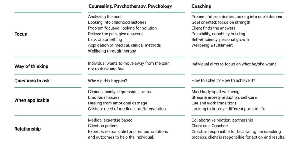 Difference between Counseling, Psychotherapy, Psychology, and Coaching?